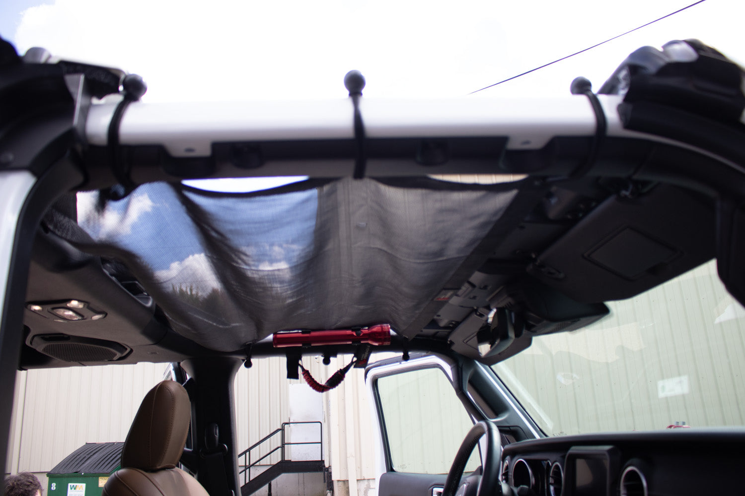 Constructed from durable and resistant Nylon Mesh, the Full Sun Shade fits securely within the roll bars and over the sound bar, providing a cooling cover that shields you and your passengers from the sun's intense rays. This versatile accessory comes with 21 bungee cords, allowing you to adjust the tightness to your preference, ensuring a perfect fit and the ideal head height. With your soft or hard top installed, this shade permits convenient storage of light items on top, enhancing your overall Jeep experience. Manufactured in the U.S.A., Fishbone Offroad delivers a high-quality solution for sun protection and style, enabling you to enjoy every ride with added comfort and functionality.