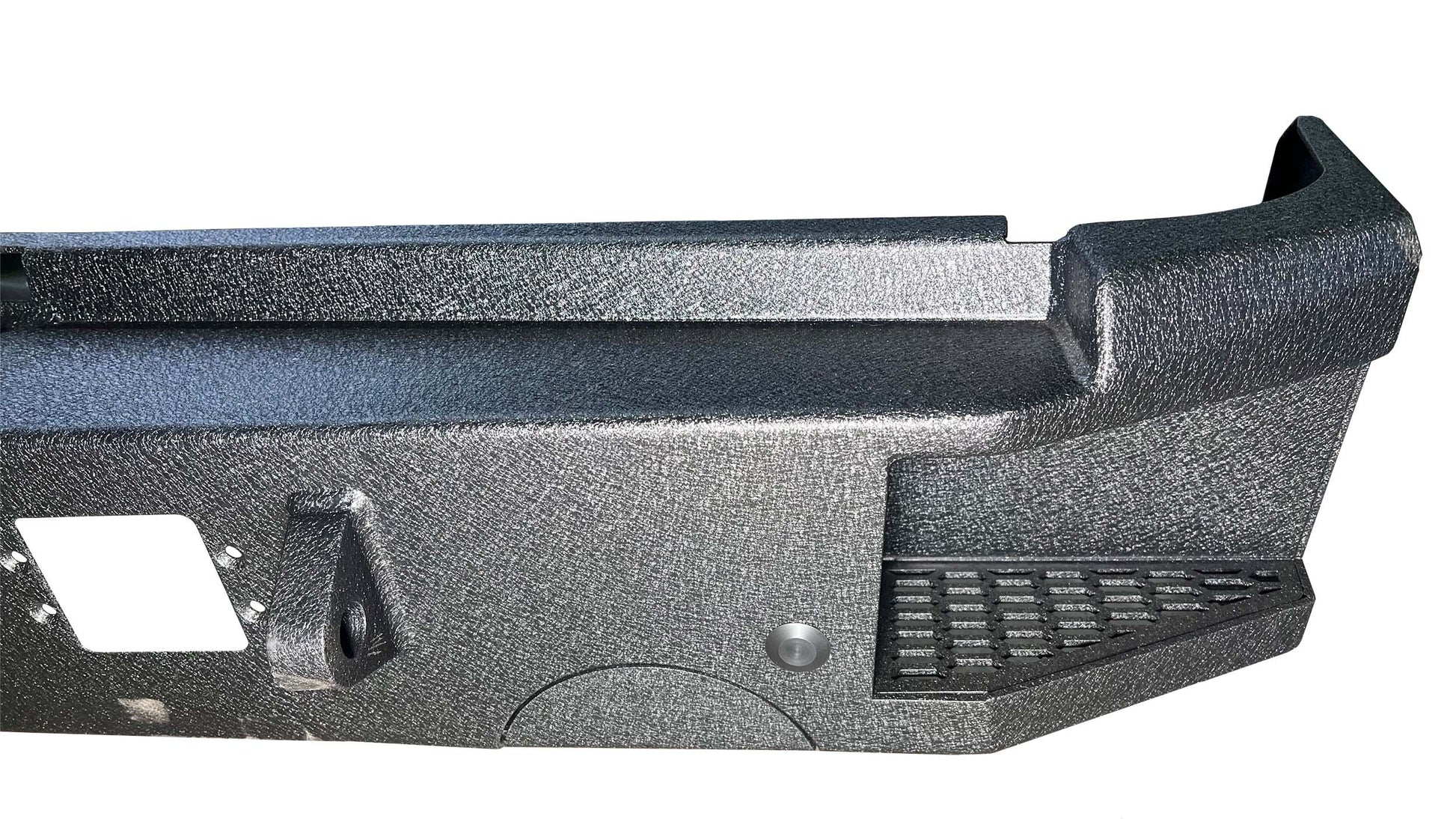 Installation is a breeze, with a bolt-on design that ensures a secure fit. But that's not all - the bumper also boasts side steps and a middle tread plate to provide enhanced foot traction. Its slim side profile ensures it stays close to the bed side, making it both sleek and functional. Furthermore, it seamlessly integrates with your truck's factory features; from License Plate Lights and trailer plugs to retaining access to the spare tire. Additionally, D-Rings and robust 5mm mounts fortify the bumper, ensuring longevity and strength.