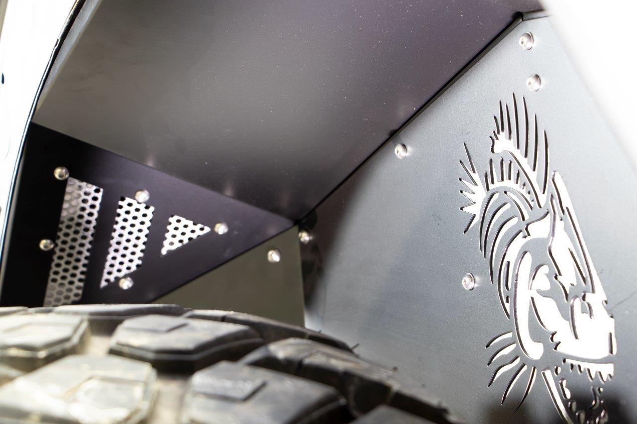 If you have Tube Fenders, you need a set of Aluminum Inner Fenders to finish the look. Once installed these offer protection from rocks and debris entering the engine compartment. These are stamped from Aluminum with the Fishbone Offroad Logo.