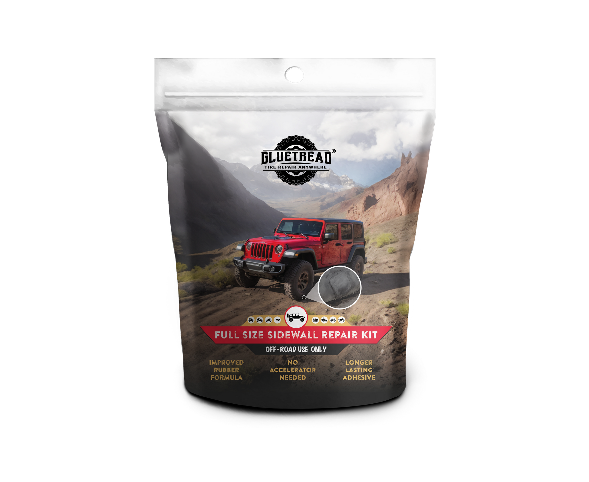The GlueTread Full-Size Sidewall Kit is designed for multiple sidewall repairs, offering durability and reliability for off-road vehicles. Tailored for full-size or 4x4 vehicles, this kit works equally well on other off-road vehicles, providing peace of mind wherever the trail takes you.