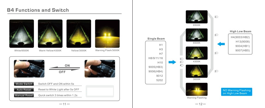 The G4-RS series LED headlight kit allows you to change the color of light to adapt to all conditions. These offer a 6500K cool white to improve your visibility at night, a yellow light at 4300K and 3000k amber which provide clearer vision on rainy, foggy, snowy, and dusty days. The flashing mode can be used when facing emergency situations, available on certain bulbs. If your bulb has a Hi/Low combo they will not do the flash function.